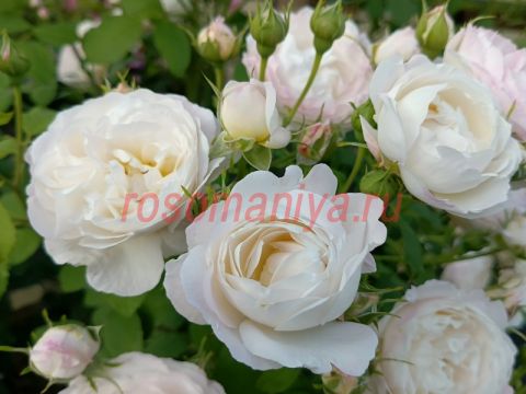 Кремовые, с розово-фиолетовыми полосами бутоны раскрываются в прелестные, густо-махровые, кремовые цветки с розовыми тенями по краям. Ароматные цветки собраны в изящные кисти, особенно красиво выделяющиеся на фоне здоровых тёмных матовых листьев. Количество шипов умеренное, побеги прямые, хорошо разветвлённые, образуют красивый куст.