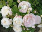 Кремовые, с розово-фиолетовыми полосами бутоны раскрываются в прелестные, густо-махровые, кремовые цветки с розовыми тенями по краям. Ароматные цветки собраны в изящные кисти, особенно красиво выделяющиеся на фоне здоровых тёмных матовых листьев. Количество шипов умеренное, побеги прямые, хорошо разветвлённые, образуют красивый куст.
