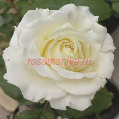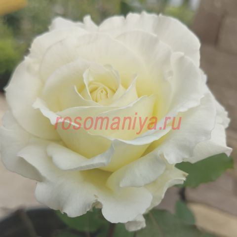 Роза с большими, великолепного сложения цветками, чистого белого цвета, с легким кремовым оттенком в центре. Бутоны округлые, белые, слегка зеленоватые, цветок густомахровый, чашевидный, с волнистыми зубчатыми краями лепестков. Аромат легкий. Цветение волнами в течение сезона.