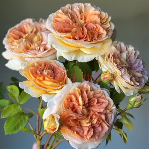 Длинные, элегантные, абрикосово-желтые бутоны раскрываются в классические плоские розетки, наполненные множеством плотно уложенных лепестков. Цветы демонстрируют красивое сочетание оттенков: верхняя сторона лепестков имеет нежный абрикосово-розовый тон, в то время как нижняя сторона - приятный мягкий желтый оттенок. Наружные лепестки каждого цветка - кремового тона.