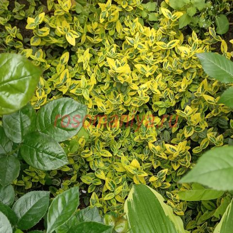 Очень декоративный вечнозелёный ползучий кустарник сферической формы. Листья кожистые, глянцевые, тёмно-зелёные с чёткой жёлтой каймой. Высоко ценится за окраску. Осенью растение становится красновато-бурым.