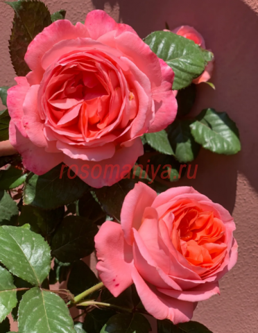 Цветки махровые, шаровидные, великолепного кораллово-розового цвета. Аромат фруктов, розового масла и лимонной травы очень сильный. Цветение обильное, повторное до осени. Листва высокоустойчивая к заболеваниям.