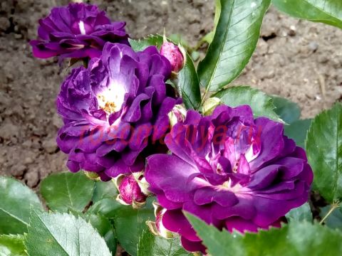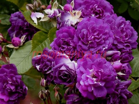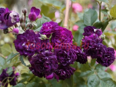 Раскрывающиеся цветки темно-розовые или малиновые, становятся сначала пурпурными, потом фиолетовыми, и наконец, фиолетово-синими, но общее впечатление – темно-пурпурного. У многих цветков от центра идут белые потеки. Цветки густомахровые, плоские розетки. Появляются в плотных кистях средних размеров. Побеги почти лишены шипов, листва мелкая, густая.