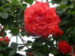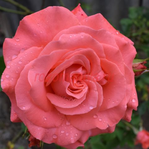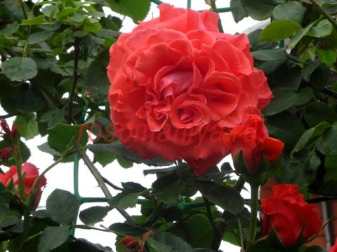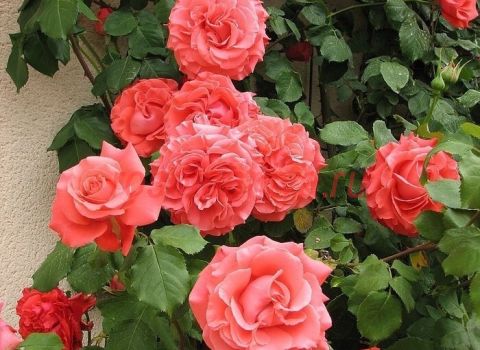 Куст очень мощный с крупной матовой листвой. Цветы расположены и в соцветиях и одиночно. Цвет розово-коралловый. Запах средний. Не боится дождей, сорт достаточно устойчив к болезням.