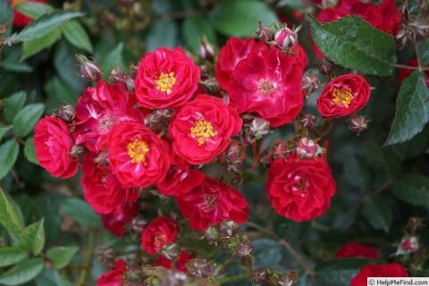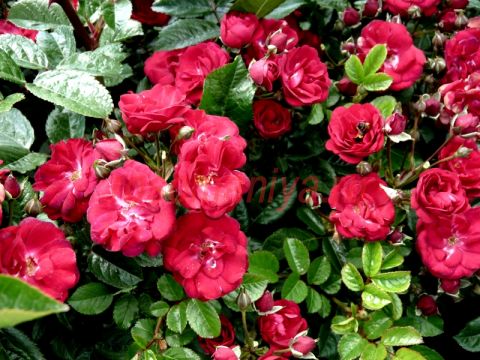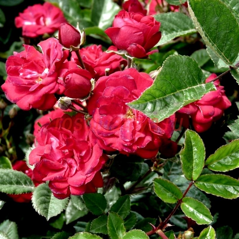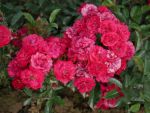 Роза из серии "Семь гномов". Малиновые, с белым глазком в центре, цветки собраны в большие плотные соцветия. Цветение обильное. Кусты компактные, полусферической формы.