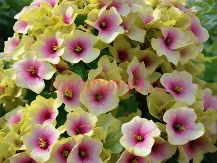 Желто-зеленые бутоны раскрываются в цветы с зелено - желтыми краями и светло - розовым или белым центром.