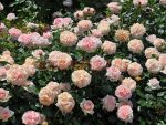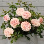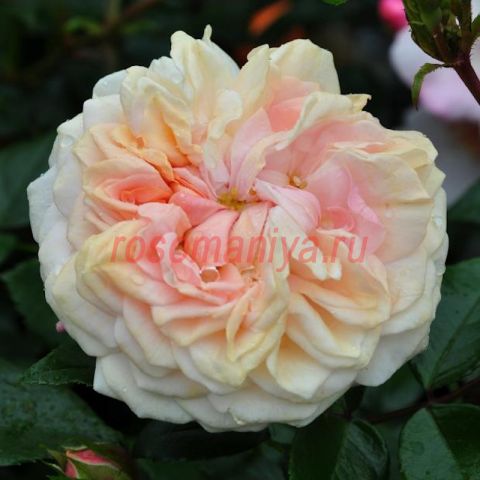 Компактный сорт в кремово-розовых тонах. Куст прямостоячий, цветки розетковидные, густомахровые, с нежным ароматом. Лист зеленый, средний, полуглянцевый, плотный, кожистый.