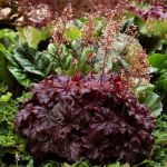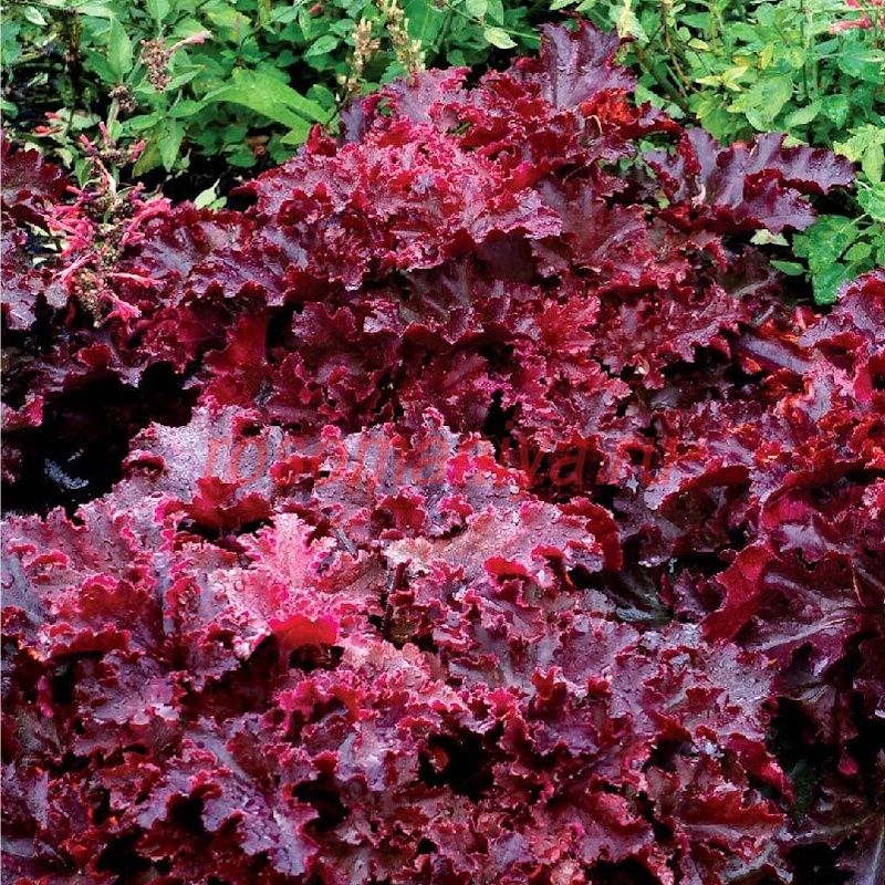 Листья широкие гладкие с резными, сильно гофрированными краями, в плотной розетке, весной ярко-малиновые, затем цвет становится более глубоким с тёмно-бордовыми бликами. Даже в самую жаркую погоду красные тона сохраняются. Цветки белые, многочисленные. Цветоносы тёмно-красные.