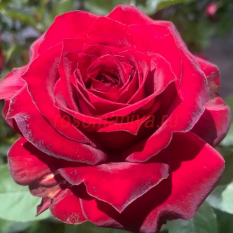 Цветки эффектные, крупные, махровые, с высоким центром, в начале раскрытия бархатно-красные, затем с малиновым оттенком, раскрываются медленно. Аромат дамасской розы с фруктовыми нотами, интенсивный. Цветение повторное в течение сезона. Стебли длинные. Листва густая тёмно-зелёная, высокоустойчивая к болезням.