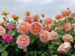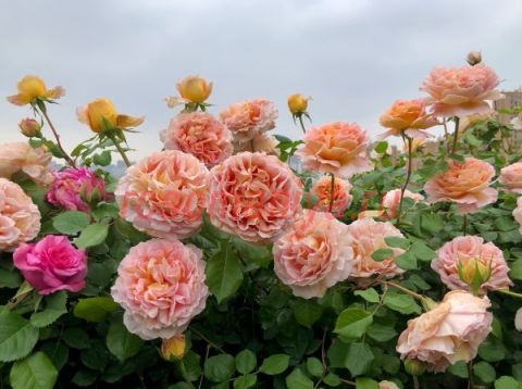 Цветки классической формы старинной розы, чашевидной формы, медно-абрикосового цвета в центре, к краю цветка лепестки становятся более розовыми. Цветки крупные, густомахровые, лепестки плохо осыпаются и иногда буреют и засыхают прямо на кусте. Возможно появление ржавчины. Сорт зацветает одним из первых и цветет практически непрерывно. Внутренняя часть лепестков окрашена в розово-персиковый цвет. Внешняя сторона имеет светло-желтый оттенок. Внутренние лепестки слегка свернуты, поэтому роза играет желто-розовыми оттенками. Края лепестков при расцветании волнистые.