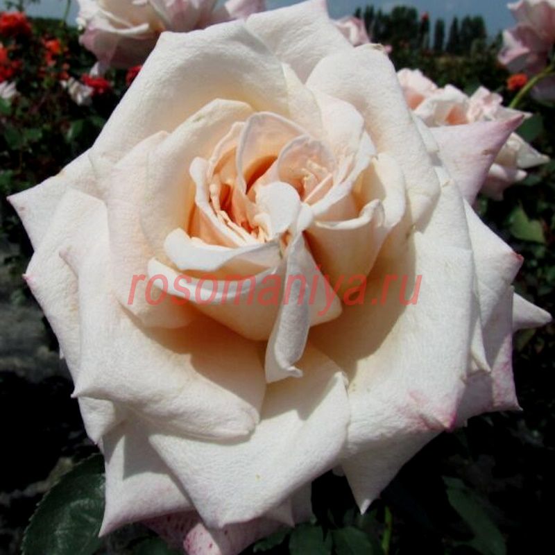 Бутоны темно-розовые, цветы привлекательные, крупные, двуцветные, кремово-белого цвета с насыщенной розовой окантовкой и сильным ароматом, на длинных крепких стеблях, идеально подходящих для срезки. Цветение волнами, повторяется до осени. Листва полуглянцевая, очень здоровая.