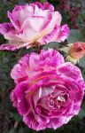 Цветовая палитра сорта сочетает сиреневые, лиловые, фиолетовые оттенки с белой каймой по краю волнистых лепестков. В полном роспуске виднеются золотистые тычинки.
