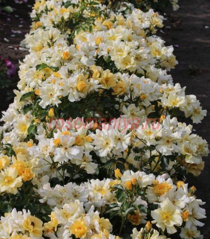 Бутоны ярко-оранжевые. Цветки светло-жёлтые, с возрастом становятся белыми, полумахровые, собраны в соцветия. Непрерывное цветение в течение всего сезона. Средняя, блестящая, тёмно-зелёная листва.