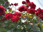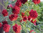 Цветки очень крупные, темно-красные, средне-махровые , классической формы в полуроспуске и открытой чашевидной - в полном, с сильным ароматом, на гибких побегах как одиночные, так и в небольших соцветиях.