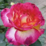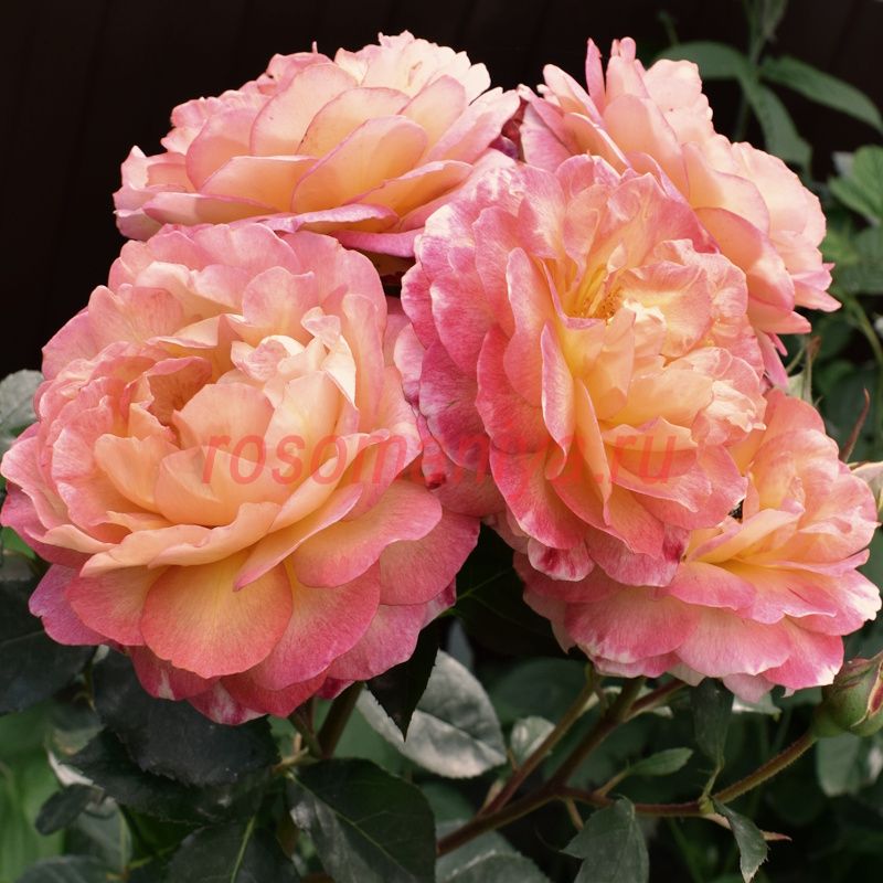 На энергичном розовом кусте заостренные бутоны раскрываются в густомахровые цветки. Яркие лепестки в полном роспуске придают цветку округлую чашевидную форму, цвет лепестков меняющийся, - желтый, оранжевый смешивается с розовыми и карминовыми тонами.