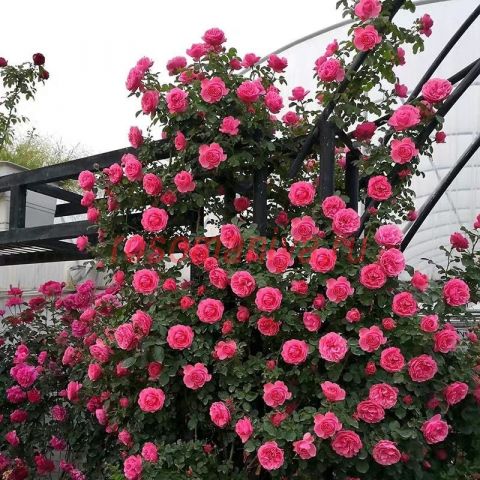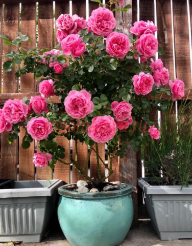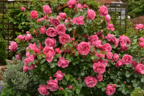 Насыщенно-розовые густо-махровые цветки, в центре квартированные, лиcтва обильная, кожистая. Куст прямостоячий, кустистый, очень компактный. Цветет обильно и продолжительно, не боится дождей, не выгорает.