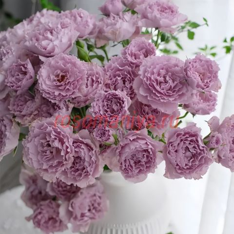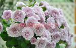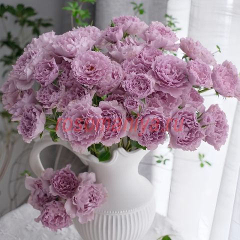 Роза японской селекции, известная у нас как «Стрекоза», с ароматными махровыми цветками, с волнистыми лепестками лавандовой окраски, меняющейся от глубоко сиреневой до бледно-серебристой. Цветение повторное. Листва средне-зеленая, матовая.