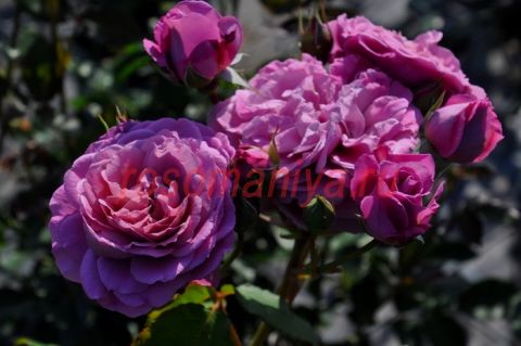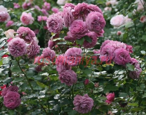 Бутон овальный. Цветки сиреневые, крупные, махровые (до 60 лепестков), душистые, в соцветиях. Кусты сильнорослые, вертикальные. Листья темные, кожистые. Цветение обильное.