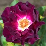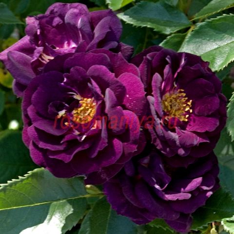 Темно-фиолетовые, умеренно-махровые цветки с ярко-желтыми тычинками и светлым пятном в центре. Сильный аромат гвоздики и специй. Куст густой, компактный, с полу-глянцевой, светло-зеленой листвой.