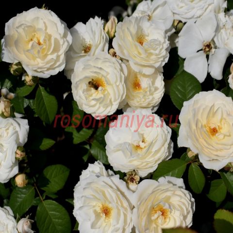 Чисто-белая версия сорта Bouquet Parfait. Белые или кремовые, полумахровые, глубоко-чашевидной формы и снежно-белой окраски цветки с лёгким ароматом. В центре видны золотистые тычинки. Сорт очень стоек к дождю и ветру, очень зимостоек.