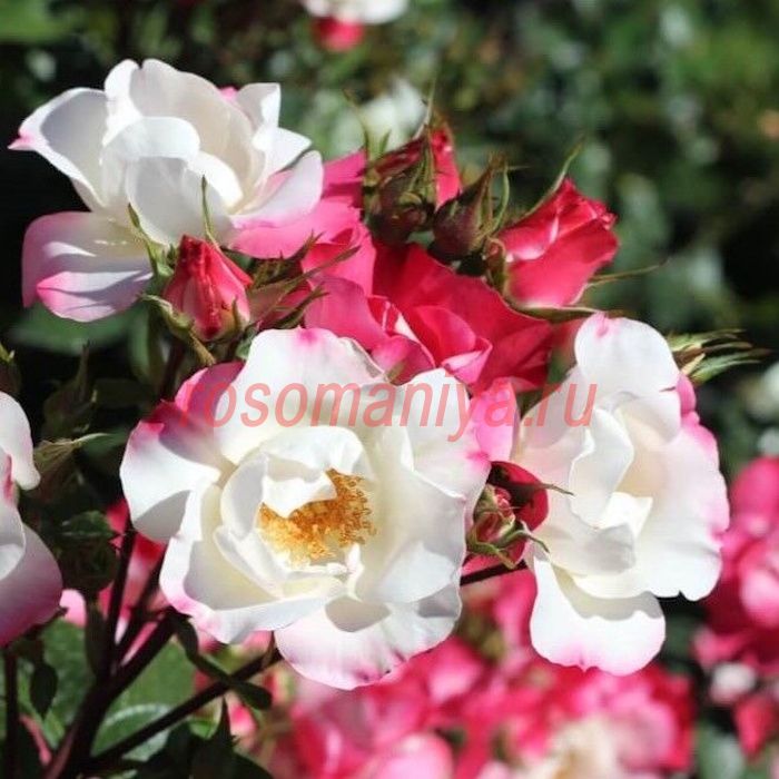 Полумахровые белые цветки, с возрастом приобретают розовый оттенок. Куст компактный.