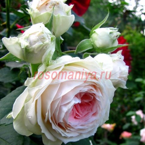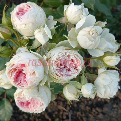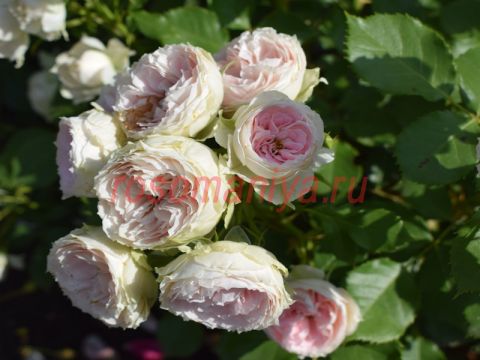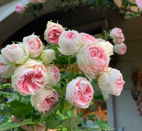 Цветки кремовые, с нежно-розовым центром, густомахровые. Цветки мелкие или средних размеров, в кистях, чашевидные.