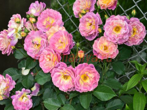 Цветки клубнично-розовые с желтым центром и с абрикосовым реверсом. Куст высокий, может использоваться как невысокая плетистая роза.