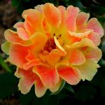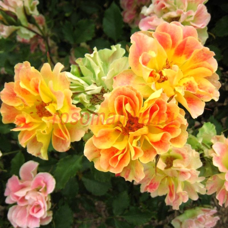 Цветки у PurCaprice необычные - как по форме, так и по цвету. Едва раскрывшись, они насыщенного золотисто-желтого цвета. Затем у лепестков появляется широкая красная окантовка, и они начинают терять желтый цвет. К тому времени, как цветок станет белым, красные кончики превращаются в зеленые. Форма лепестков делает эти изменения цвета еще более впечатляющими: лепестки очень волнистые, расположены под углом, что очень необычно для розы. Цветет практически непрерывно и долго держит лепестки уже после того, как они позеленеют.
