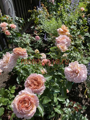 Крупноцветковый шраб розово-лососевого цвета. Цветки махровые, старинной формы, ароматные. Цветение повторное.