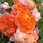 Кустовая, компактно растущая флорибунда демонстрирует свежую игру цветов интенсивного оранжевого цвета с желто-кремовой оборотной стороной лепестков.