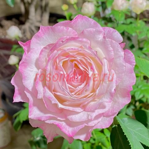 Чайно-гибридная роза с махровыми цветками, белыми с карминно-розовыми краями лепестков и легким, сладким и освежающим ароматом благовоний. Листва средне-зеленая, довольно устойчивая к болезням.