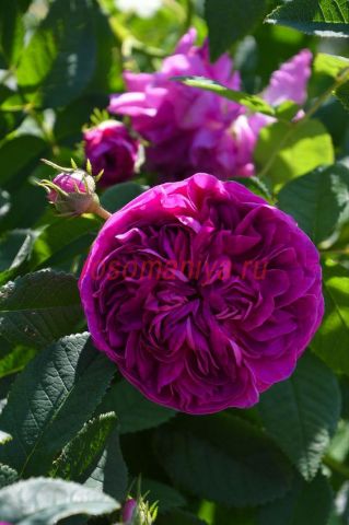 Это одна из самых распространенных старинных роз, и популярность ее вызвана великолепными цветками, силой роста, цветом и легкостью в выращивании. Цветки крупные, вначале слегка чашевидные, с массой мелких лепестков в центре. Цветки немного варьируют по окраске, но всегда присутствуют пурпурный или малиновый тон, часто с черными, сливовыми или фиолетовыми оттенками. Отдельные цветки долго не отцветают, появляются в кистях. Куст почти бесшипный, с матовой жесткой листвой, с дуговидно поникающими побегами, которые гнутся под тяжестью цветков. Куст лучше подвязывать, корнесобственное растение выпускает много корневых отпрысков.