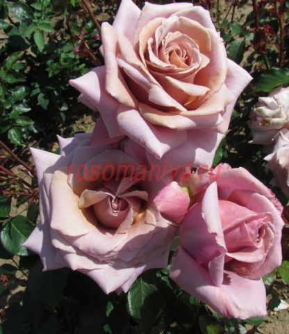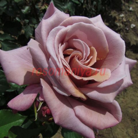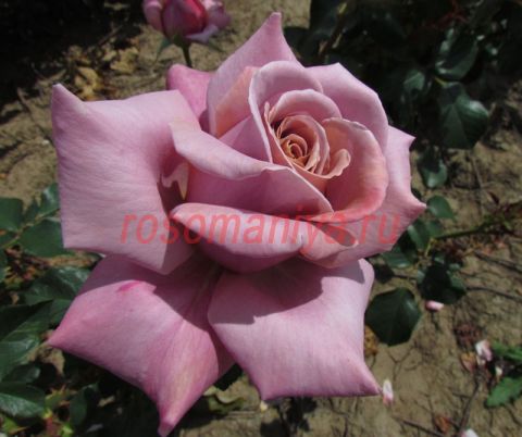 Классические бутоны с высоким центром. Очень крупные, душистые цветки сиренево-лавандового оттенка. Листва темно-зеленая, глянцевая.