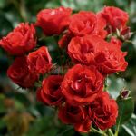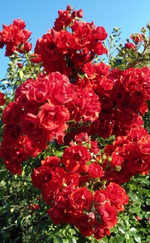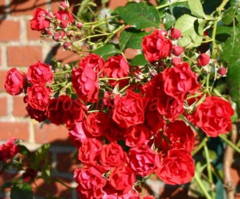 Плетистая роза с сильным ароматом. Цветки яркого красного цвета, с волнистыми резными лепестками. Цветение в течение сезона, большими кистями, - полумахровые мелкие цветочки покрывают куст сверху донизу. Плотная глянцевая листва. Хорошая устойчивость к болезням.