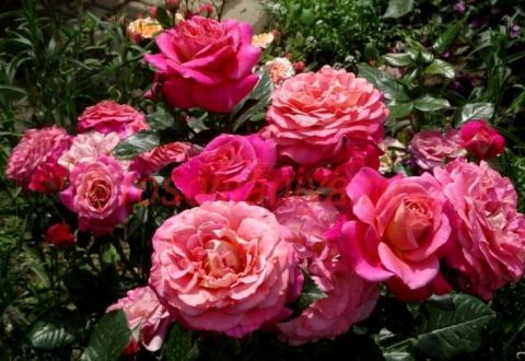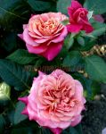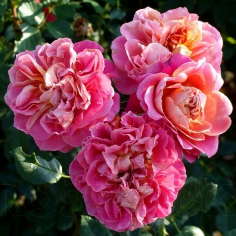 Цветки крупные, махровые, тёмно-розовые с абрикосовыми оттенками. Аромат умеренный, фруктовый. Листва тёмно-зелёная, глянцевая, устойчивая к заболеваниям.