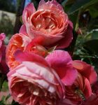Цветки округлые и крупные, как у английских роз. Их цвет представляет собой смесь розового, оранжевого и лососевого цветов с янтарно-желтым центром, что производит приятный эффект.