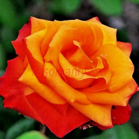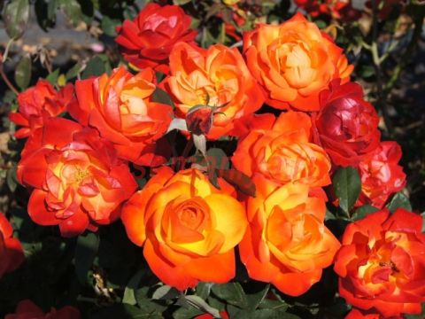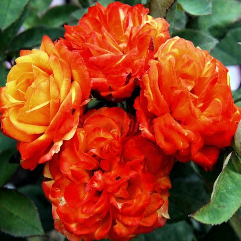 Цветет обильными волнами. Цвет очень яркий, пылающий, желто-красно-оранжевый с большим или меньшим преобладанием одного тона в зависимости от погоды. Цветки чашевидные, умеренно-махровые, в полном роспуске показывают серединку. Листва темно зеленая, плотная, с отличной устойчивостью к болезням.