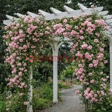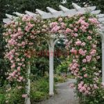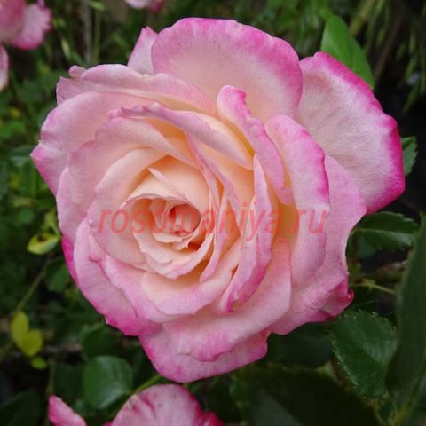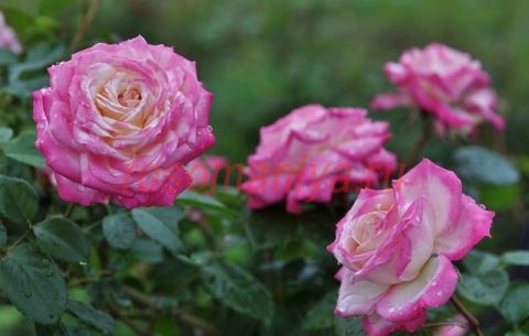 Цветки ажурные, цвет розово-кремовый, кремовый центр, розово-кремовые края. Умеренный аромат. Среднего размера, очень пышные, собраны в небольшие соцветия, чашевидная форма цветка. Цветет волнами в течение всего сезона.