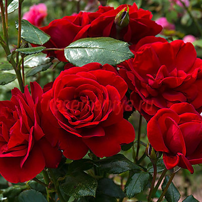 Цветки яркие, густо-красные, очень крупные, махровые, в кистях. Аромат легкий. Листва темно-зеленая, очень блестящая. Куст ветвистый, прямостоячий. Обильное повторное цветение осенью. Превосходная устойчивость к болезням.
