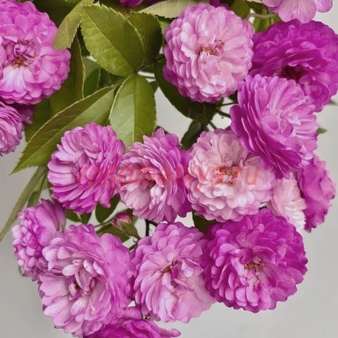 Сильный аромат. Мелкие, махровые цветки образуют крупные, длинные соцветия. Цветет пышно в течение всего сезона. Блестящая темно-зеленая листва.